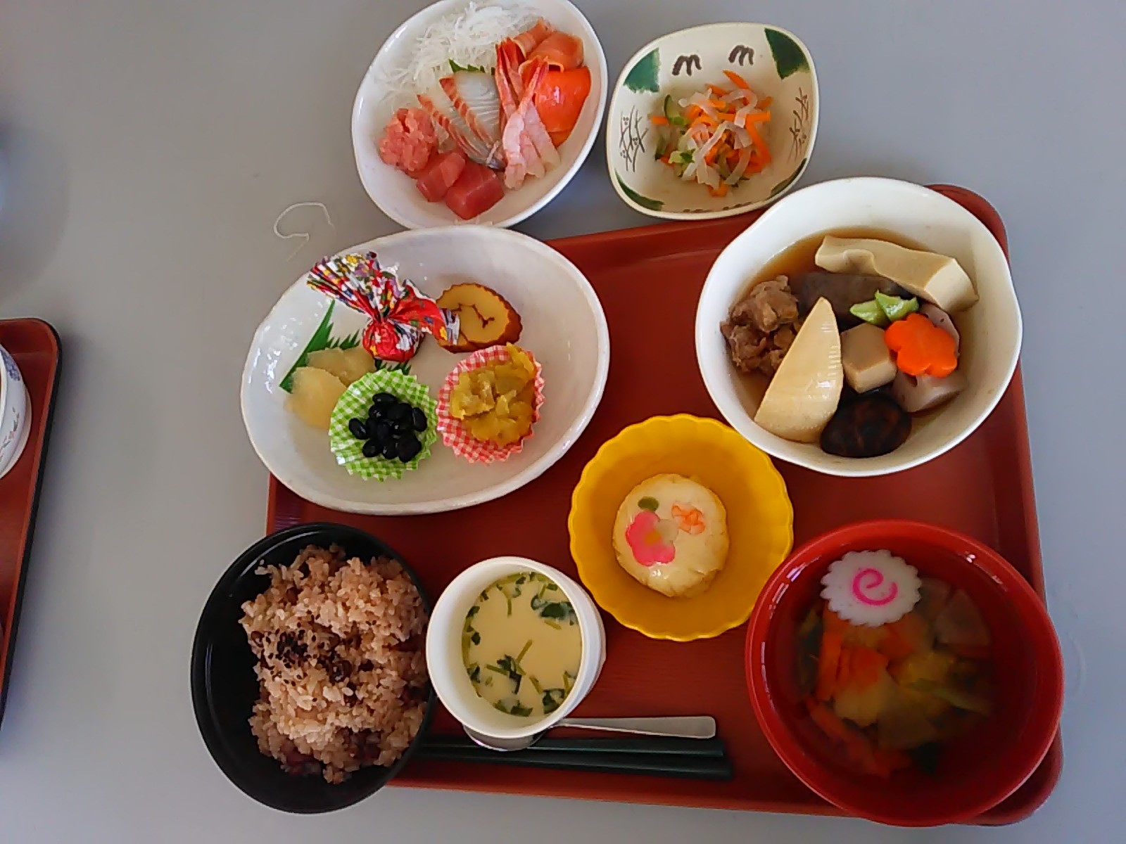お昼には、お雑煮、お節、お造り、お煮しめ、茶わん蒸し等のお料理